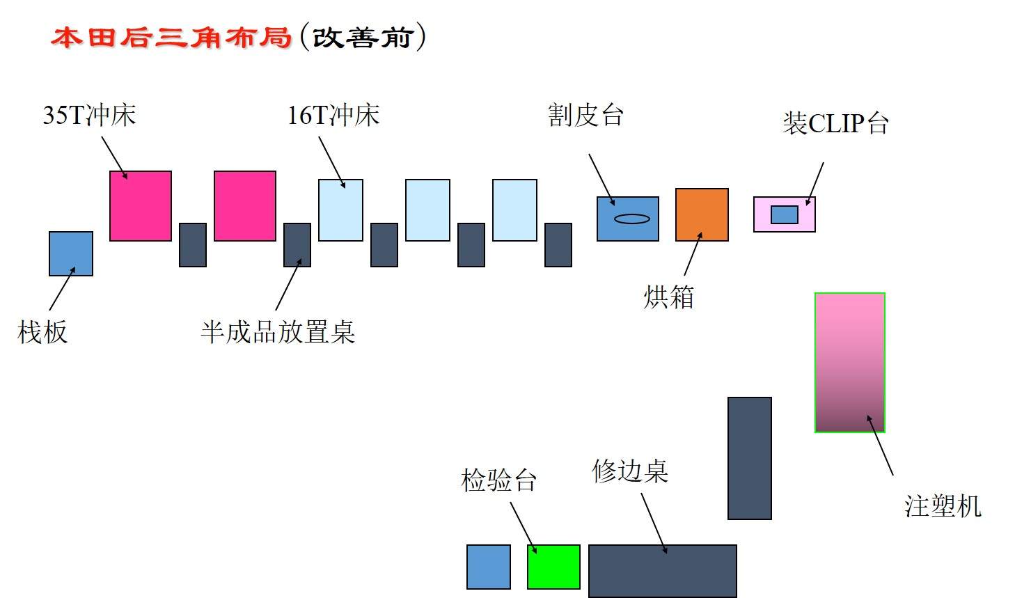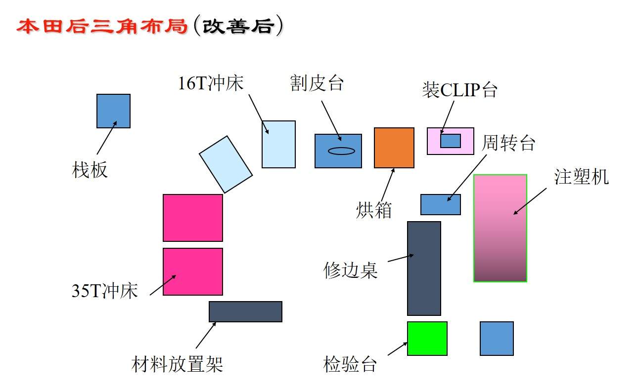 在一些工厂中经常可以看到,不同工序的加工设备之间的距离非常远,搬运到下一道工序,这样的现象被称为孤岛设备。“一个流”生产要求放弃按设备类型排列的布局,而是按照加工顺序来排列生产设备,避免孤岛设备现象的出现,尽可能使设备的布置流水线化,真正做到只有“一个流”。