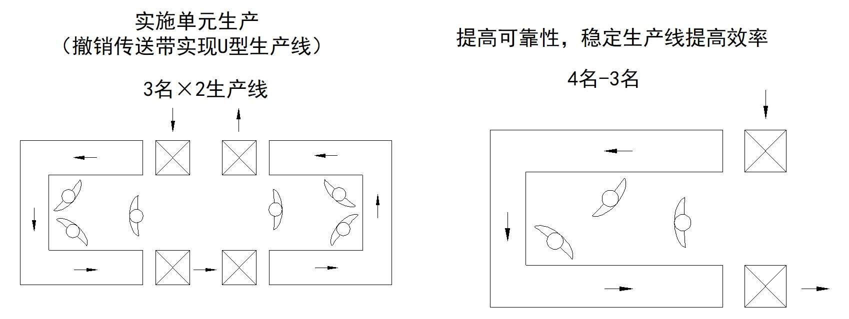 如果将生产设备一字摆开,工人从第一台设备到最后一台设备就需要走动很远的距离,从而造成严重的人力浪费。因此,“一个流”生产要求将生产设备按照“U”字型来排列,从入口到出口形成一个完整的“U”型,这样就可以大量的减少由于不同工序之间的传递而造成的走动,减少时间和搬运的浪费,增加生产效率。