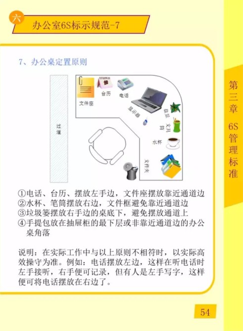 说明:在实际工作中与以上原则不相符时,以实际高效操守为准。例如:电话摆放左边,这样在听电话时左手接听,右手便可记录,但有人是左手写字,这样便可将电话摆放在右边了。