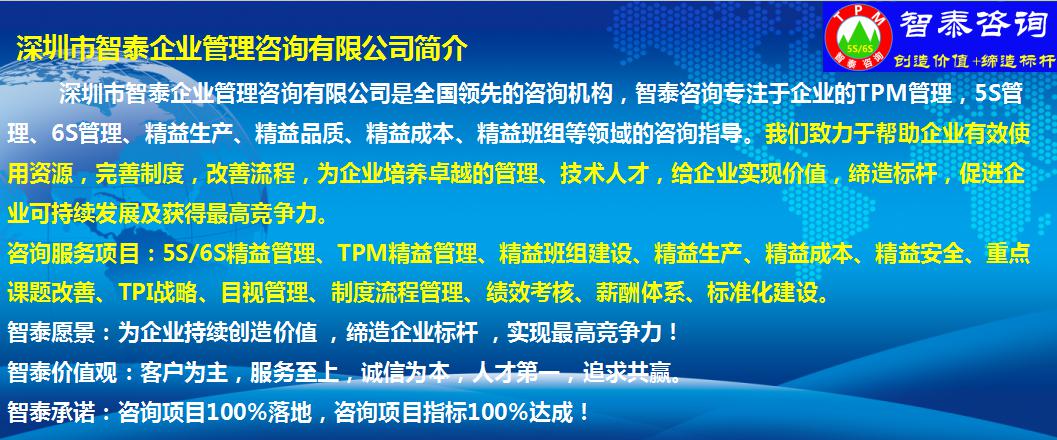 6S管理找哪家呢?首选深圳智泰咨询公司,深圳市智泰企业管理咨询有限公司是国内专业及权威的咨询机构,只专注于企业的5S/6S管理,TPM管理全面提升的咨询辅导,由具有二十年管理经验的顾问团队为您服务!万件成功案例助您树标杆,智泰咨询全力为您的企业发展及强大提供帮助!