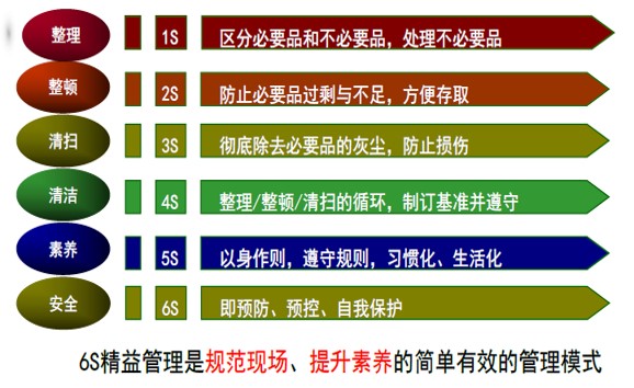6S管理是哪6个S呢?今天跟大家解说一下,6S即整理(SEIRI)、整顿(SEITON)、清扫(SEISO)、清洁(SEIKETSU)、素养(SHITSUKE)、安全(SECURITY),6S是由5S升级而来,5S管理是由日本整理编制成体系,所发是用日语发音,因其发音都是以S开头,故而被称为5S,5S管理首先在企业层面应用,企业推进5S管理体系后取得奇效,进而全面推广。