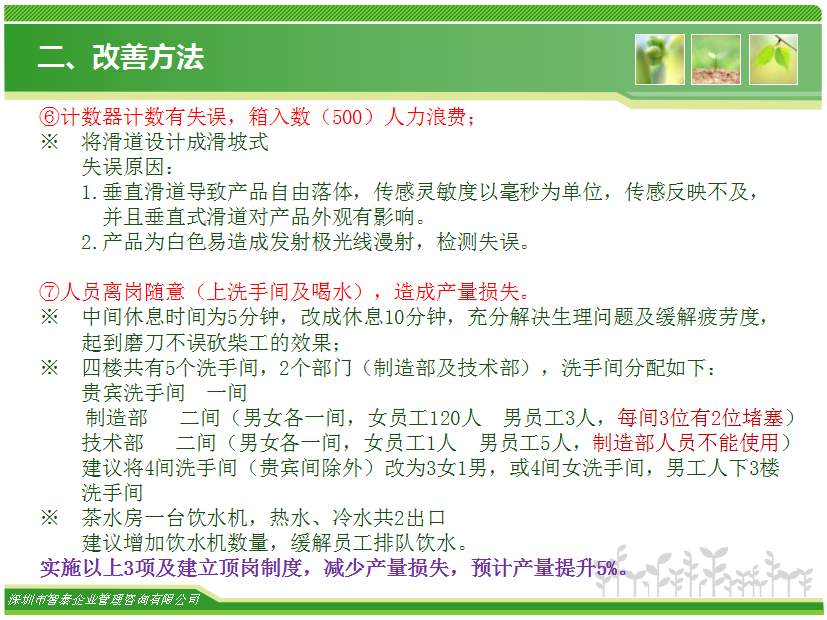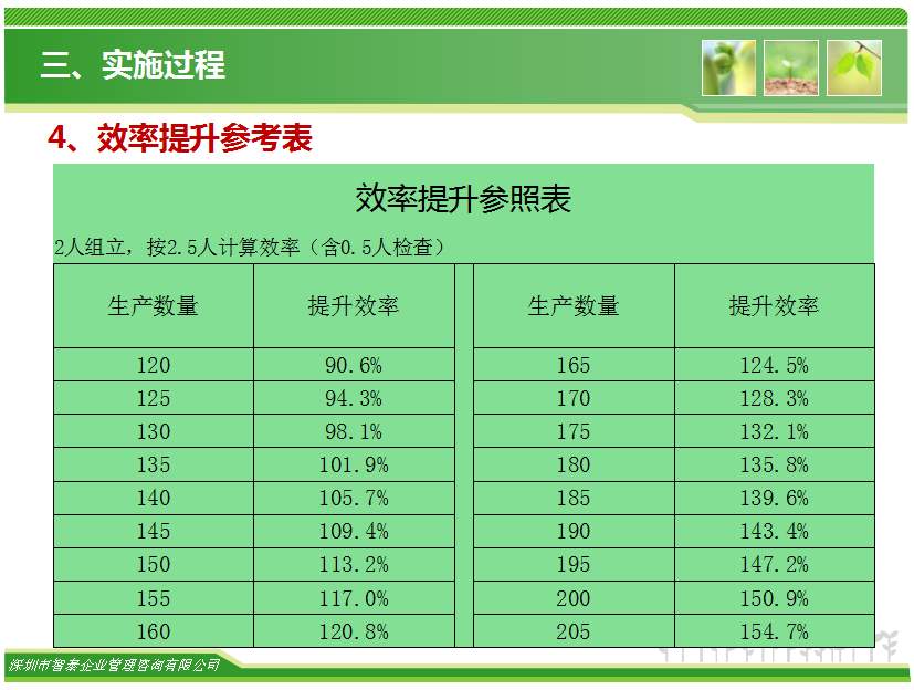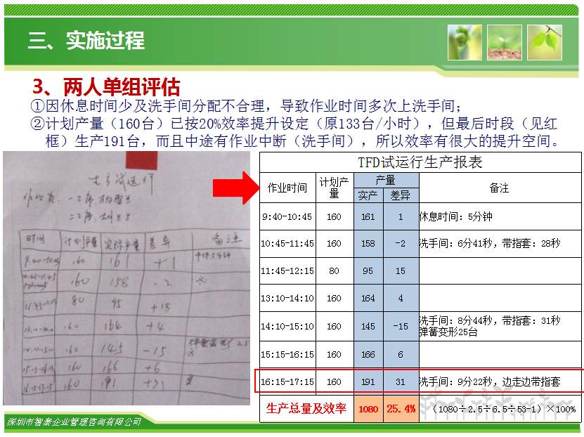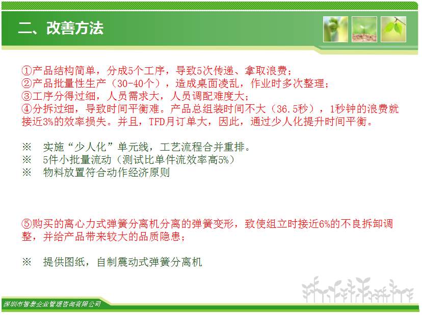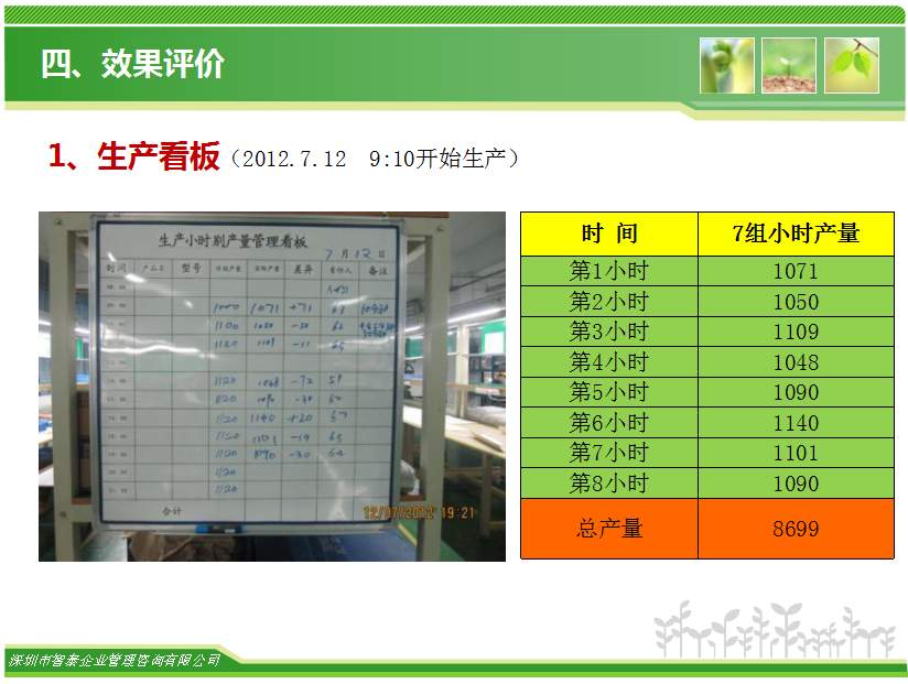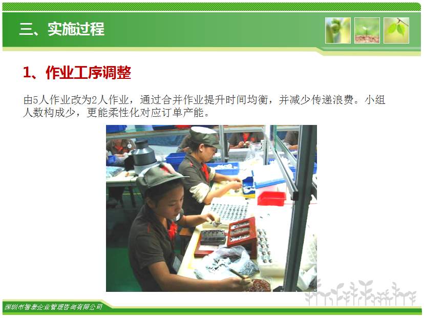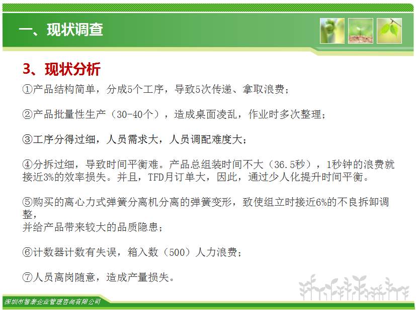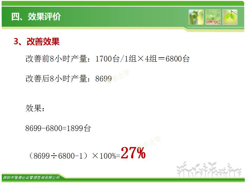在精益生产中车间经常要改进的内容是生产线上的生产平衡率问题,目前国内加工型企业的生产平衡率只有65%左右,对于智泰专业团队来说,这里面的改善空间巨大,通过智泰人的努力,在企业推进生产平衡率平均提升到85%以上,阶段为生产效率提升案例,请查阅: