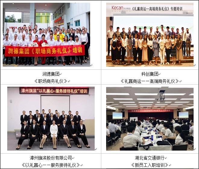 曾为深圳鹏海运公司定制化开发礼仪课程从礼仪的立场、形象礼仪、社交礼仪、服务与沟通礼仪多方位塑造,为公司打造一支精英团队。
