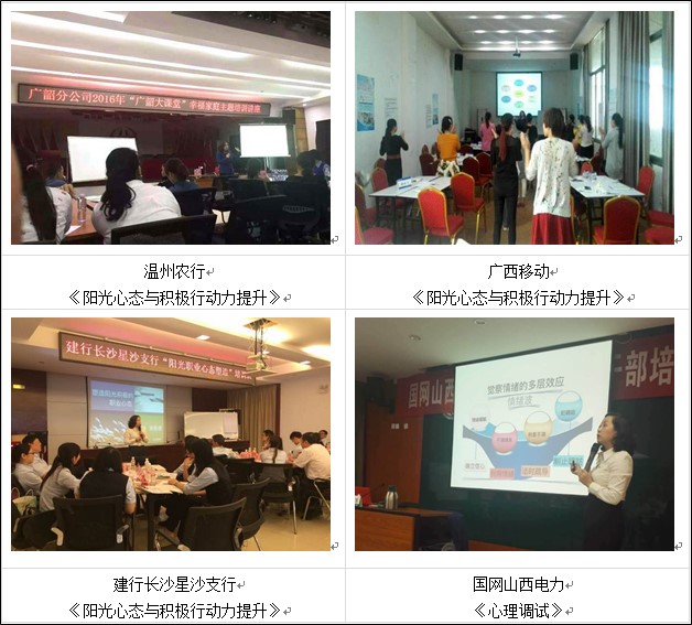 教育单位:外语外贸大学、深圳外国语初中部、南京师范大学、江苏启东中学、深圳清华实验学校、深圳东方英文书院、深圳实验学校、桃源中小学、城市绿洲学校、广州心理管理、女性研修班等